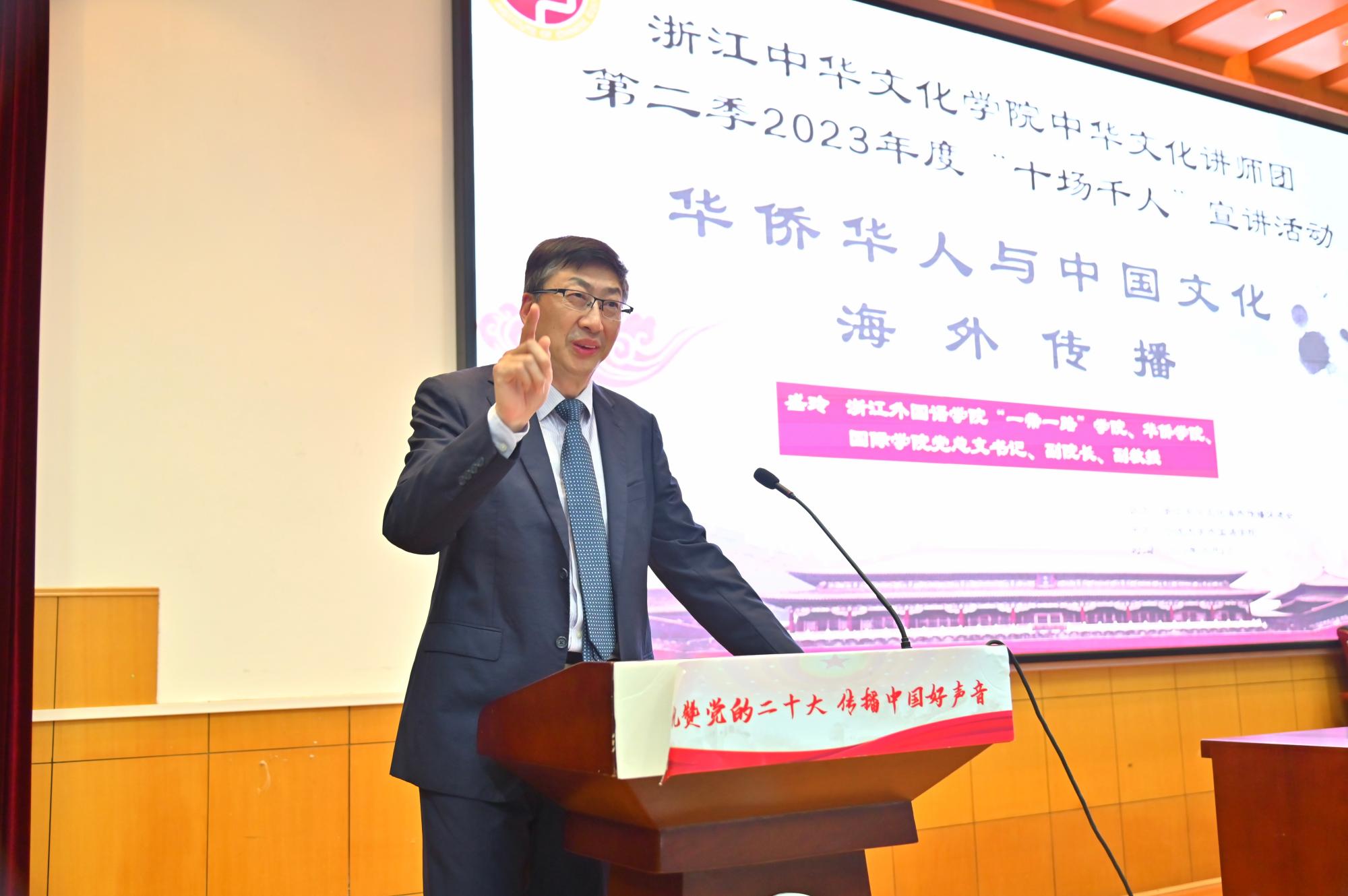 盛玲书记通过讲述非洲中国村的故事引入主题,就华人华侨的发展历史、浙江侨情的现状与特点,华侨华人传播的主要途径、传播的主要问题以及传播的现实意义做了详细阐释。他表示华侨华人对于传承和弘扬中华文化、促进文化交流和融合、增强中国文化软实力具有重要意义。盛书记特别强调,团结统一的中华民族是海内外中华儿女共同的根,博大精深的中华文化是海内外中华儿女共同的魂,实现中华民族伟大复兴是海内外中华儿女共同的梦。