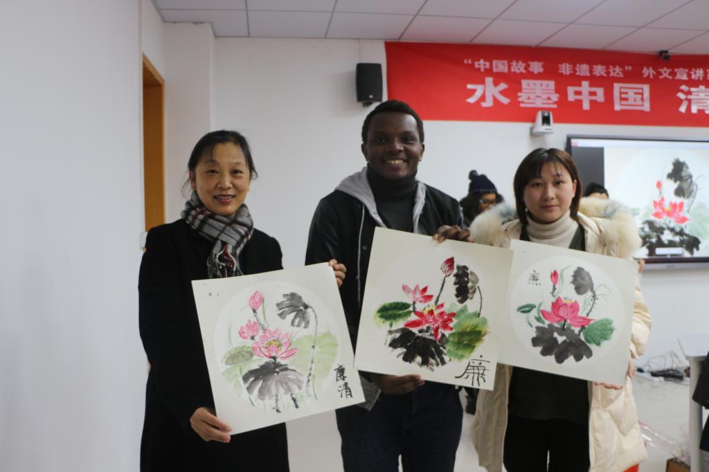 在国画老师的讲解和现场教学下,中外学生用毛笔现场创作国画“莲”,在一笔一墨中融入对清廉思想的感悟。虽然留学生中有不少是初次接触国画,但每一位留学生都热情尝试创作,并在创作过程中体验了中国传统文化的艺术魅力。