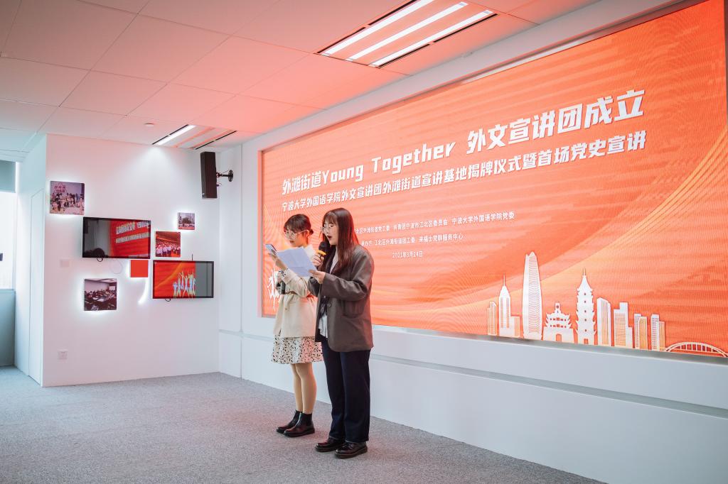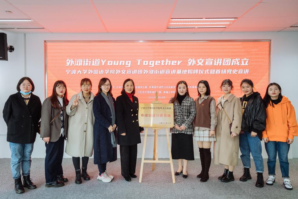 外文宣讲团外滩街道宣讲基地。本年度,外文宣讲团将带领更多在甬外籍人士走进街道、社区、企业、乡村,帮助外籍人士更好地了解中国,了解党史,从而发挥外语专业学生党员优势讲好中国故事。