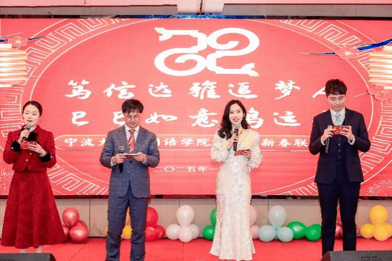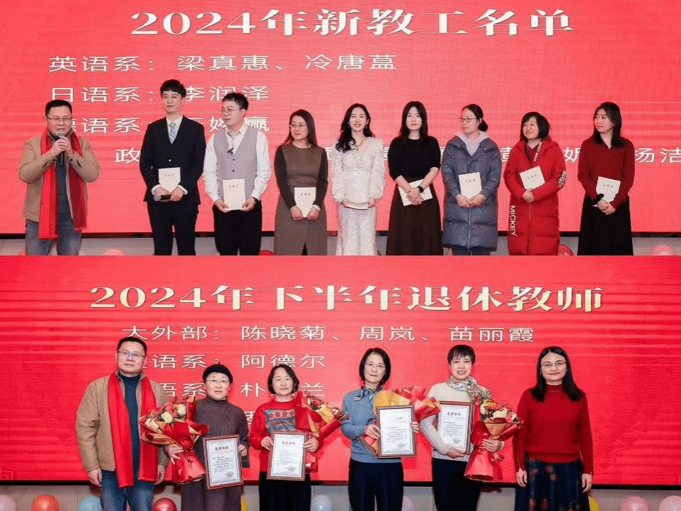 校友会承办。由96届英语系校友胡英杰、学工办施嘉婷、学工办景颢、德语系王婉赢主持。外院在职教职工、离退休教师和校友会的众多成员齐聚一堂,共迎新年。
