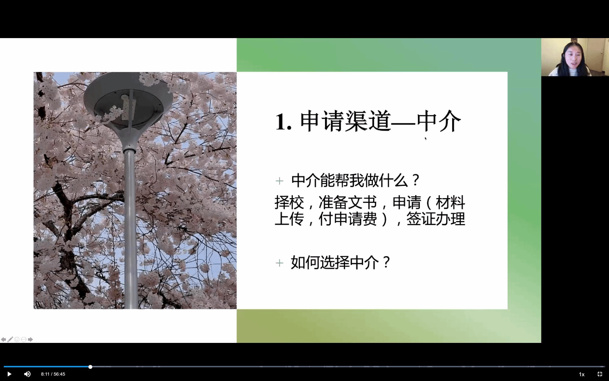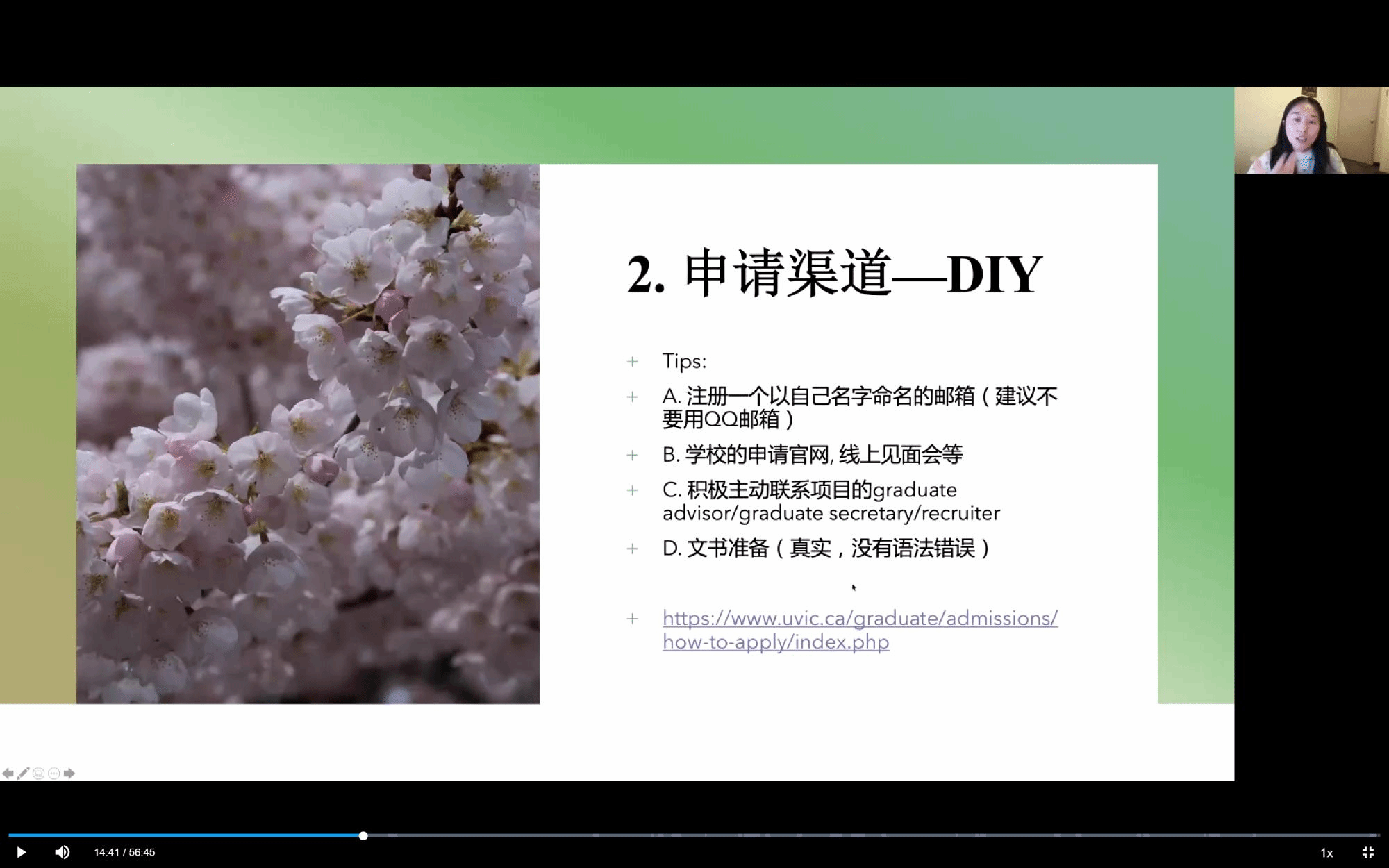 关于申请的渠道,俞学姐分享了自己求助留学中介机构和自主申请的经历,提醒同学们在选择中介时的注意事项,同时鼓励同学们多尝试自主申请这个渠道,并以加拿大维多利亚大学的留学项目申请为例,向大家演示了多米体育网