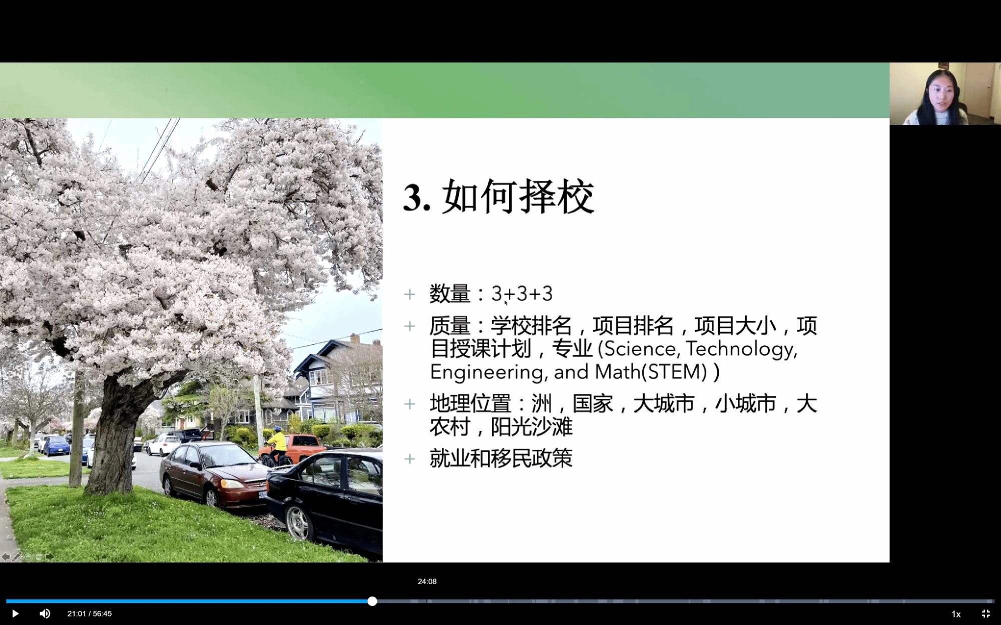 除此之外,强调了面试环节的重要性以及与未来导师的沟通技巧。第五点是关于在异域他乡学习的建议,俞学姐认为首先要做到主动说英语。在一个说英语的国家,要充分利用说英语的机会,从而提高自己的英语水平,比如参加toast masters英语演讲俱乐部;上课主动提问,课后利用教授的office hour等方式不胜枚举。