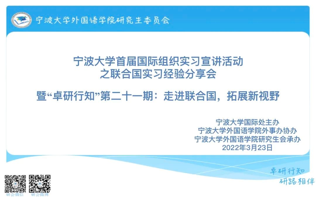 首届国际组织实习宣讲活动之联合国实习经验分享会暨“卓研行知”第二十一期:走进联合国,拓展新视野顺利举办。本活动线上线下双联动,线下在李达三外语楼422会议室举行,线上使用腾讯会议同步直播。本期特别邀请外国语多米体育网