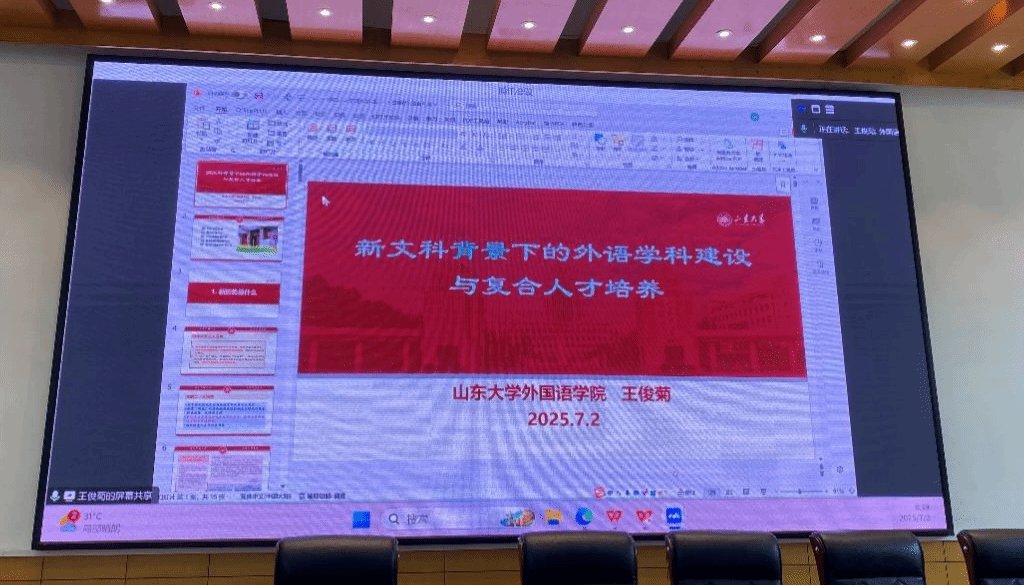 近年来在跨学科研究、人才培养模式创新等领域成果斐然。报告中,王俊菊教授立足新文科建设的时代命题,结合自身丰富的理论研究与实践经验,深入探讨外语学科发展与教育改革路径。王俊菊教授着重介绍了山东大学复合型外语专业建设中的新思路与新模式,对多米体育网