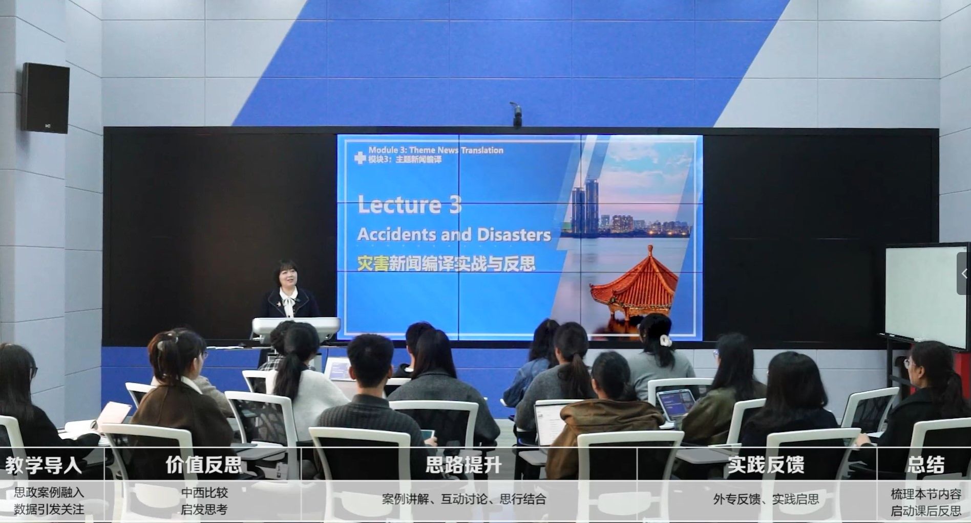 《网络新闻编译》是一门跨英语、翻译、新闻传播三个专业的“新文科”特色课程。由贺莺教授主讲,核心成员包括黄大网副教授、吴燕京教授、辛红娟教授、张旭老师(西安外国语大学)等。课程响应党的二十大报告中“加强国际传播能力建设,全面提升国际传播效能”的战略要求,响应人工智能时代教育的高阶思维转向,重在培养熟悉网媒传播手段,具有国际视野、家国情怀、能够适应人工智能时代新需求、传播好中国声音的国际新闻翻译人才。
