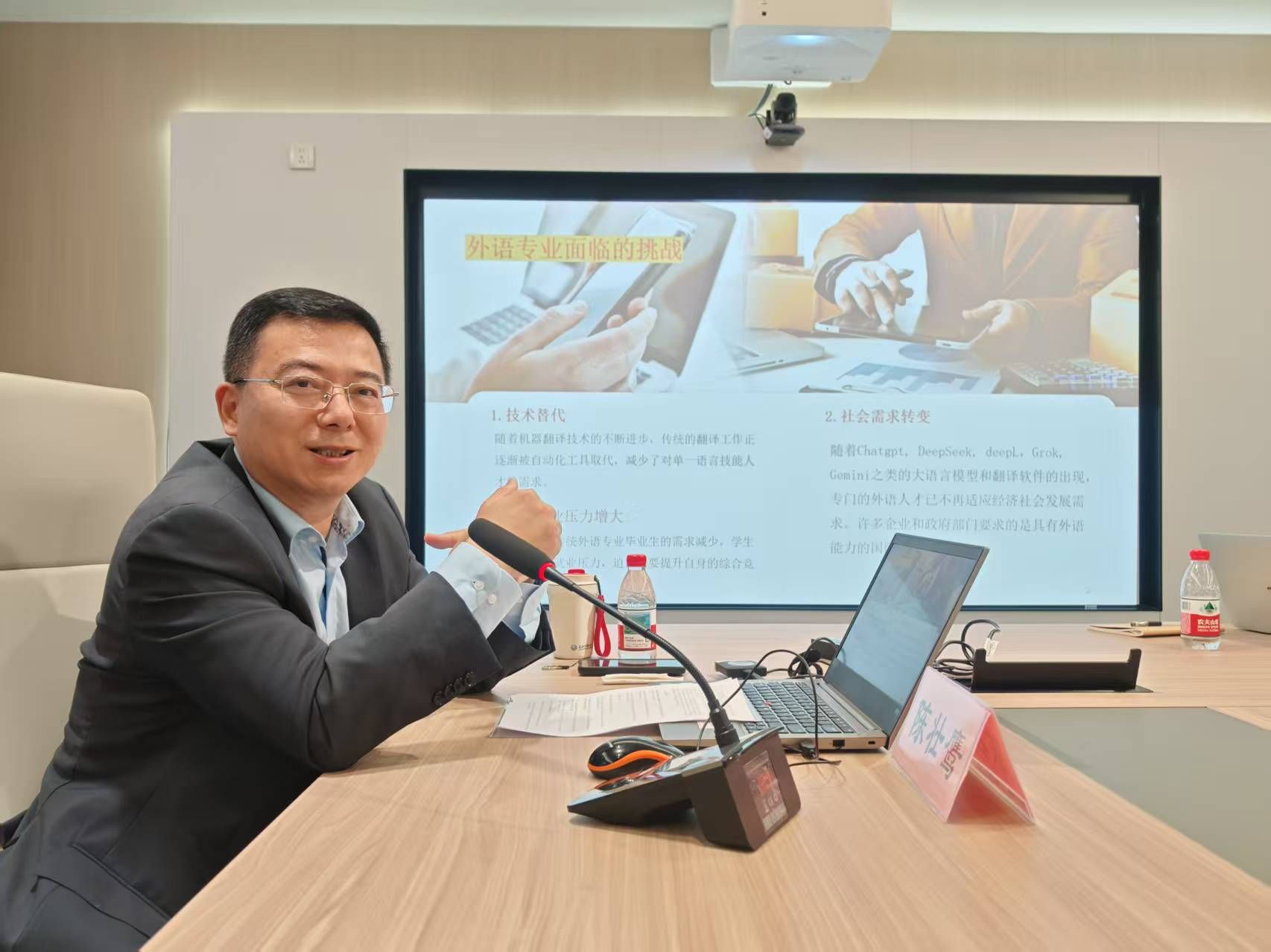 在谈到当前外语教育面临的挑战时,陈教授指出,人工智能技术的快速发展正深刻影响外语学科的生态。他建议师生理性运用人工智能工具辅助学习与研究,并特别介绍了部分大语言模型在学术写作与分析方面的优势。