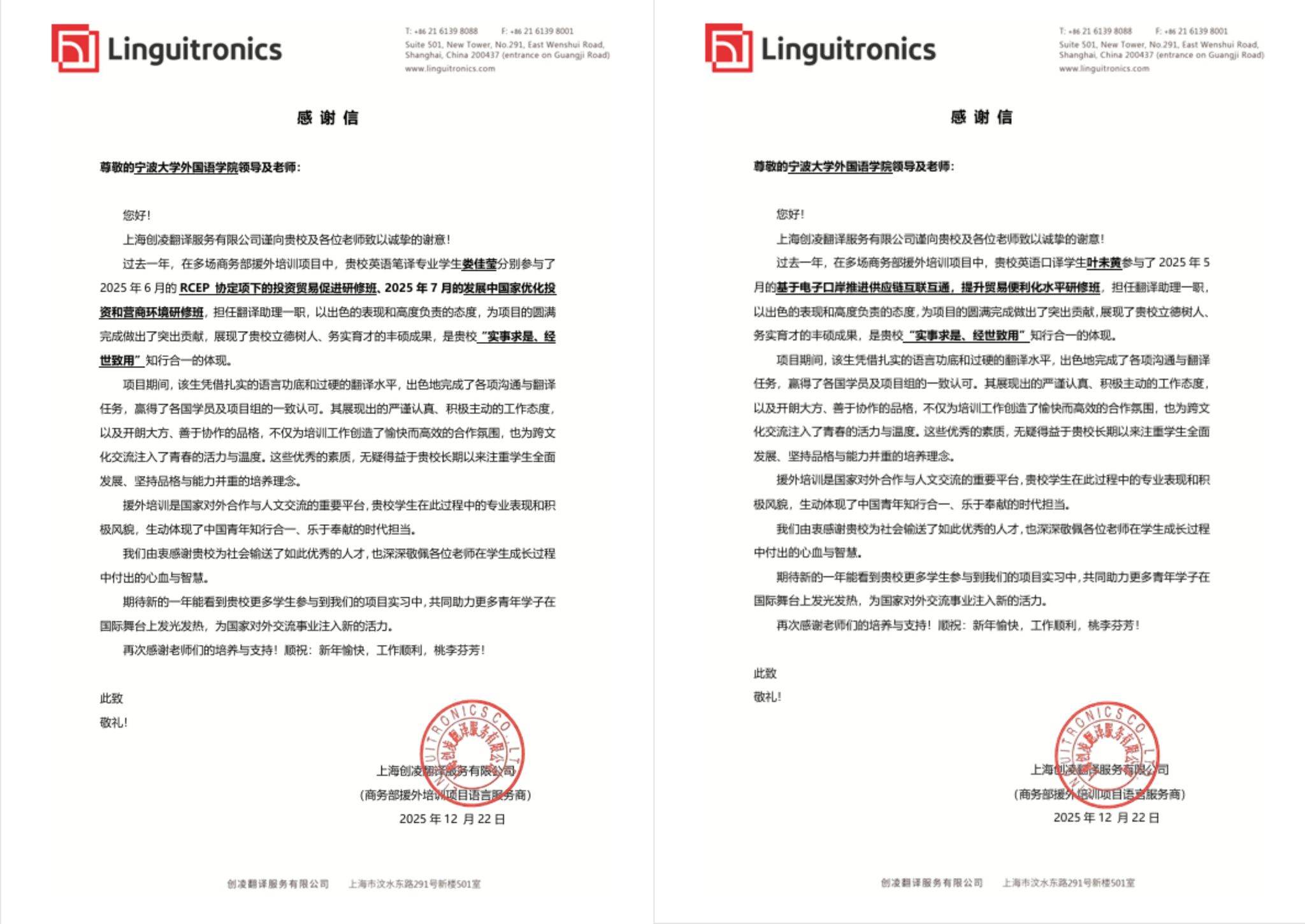 两封来自项目承办单位的感谢信,不仅是对两位同学个人能力的认可,更是对TM体育