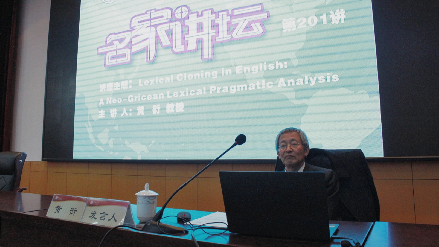 讲座伊始,黄教授提出几个关于人类语言的有趣问题,在场师生积极思考回答,现场体验了语言学研究的趣味性。接着黄教授通过丰富具体的实例讲解了英语语言中的有趣现象:词汇复制(lexical cloning),并结合语境分析了这一现象的意义和特征。比如,在英语口语中bird-bird相对于不会飞的鸵鸟、企鹅、鸡而言,可以指典型的鸟及会飞的鸟。这种现象存在于英语等语言中,在广度和意思上区别于中文的“干干净净”“学习学习”之类的叠词。在讲座的最后一部分,黄教授先介绍了新格莱斯语用理论。他是新格莱斯语用理论的两位创始人之一,提出了Q、I、M三原则。然后运用M原则分析了英语中的词汇复制现象。