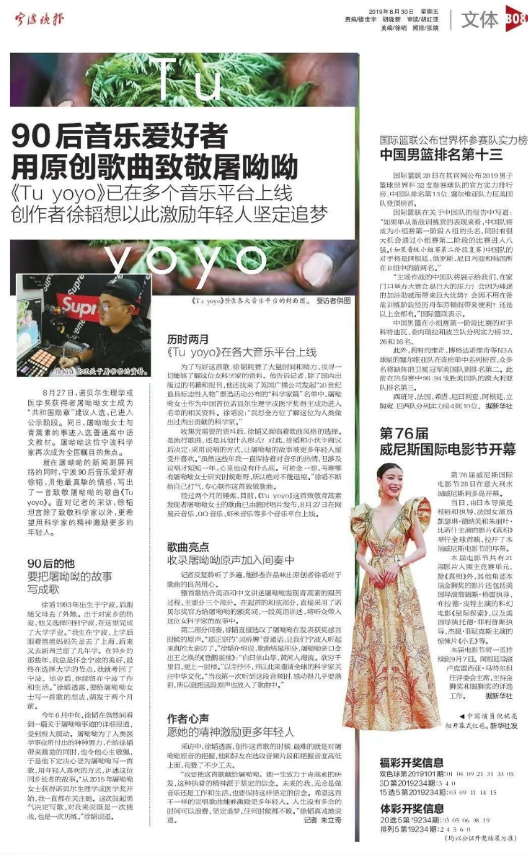 技能班毕业生、宁波90后音乐爱好者徐韬,用他最真挚的情感,耗费大量时间和精力,写出了一首致敬屠呦呦的原创中英文歌曲《ToYoyo》,希望用科学家的精神激励更多的年轻人。这首歌曲将rap与流行歌曲相结合,曲调清新,歌词感人。目前,这首致敬屠呦呦女士的说唱歌曲已在网易云音乐等多个音乐平台上线,徐韬本人也被邀请在平台进行演唱。《宁波晚报》大幅篇幅介绍他的创作。