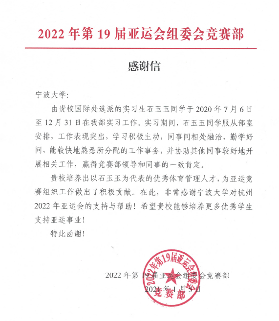 感谢信中写道:石玉玉同学于2020年7月6日至12月31日在亚组委竞赛部实习期间,服从部室安排,工作表现突出,学习积极主动,同事间相处融洽,赢得竞赛部领导和同事的一致肯定。信中还提出“贵校培养出以石玉玉为代表的优秀体育管理人才,为亚运竞赛组织工作做出了积极贡献。非常感谢多米体育网