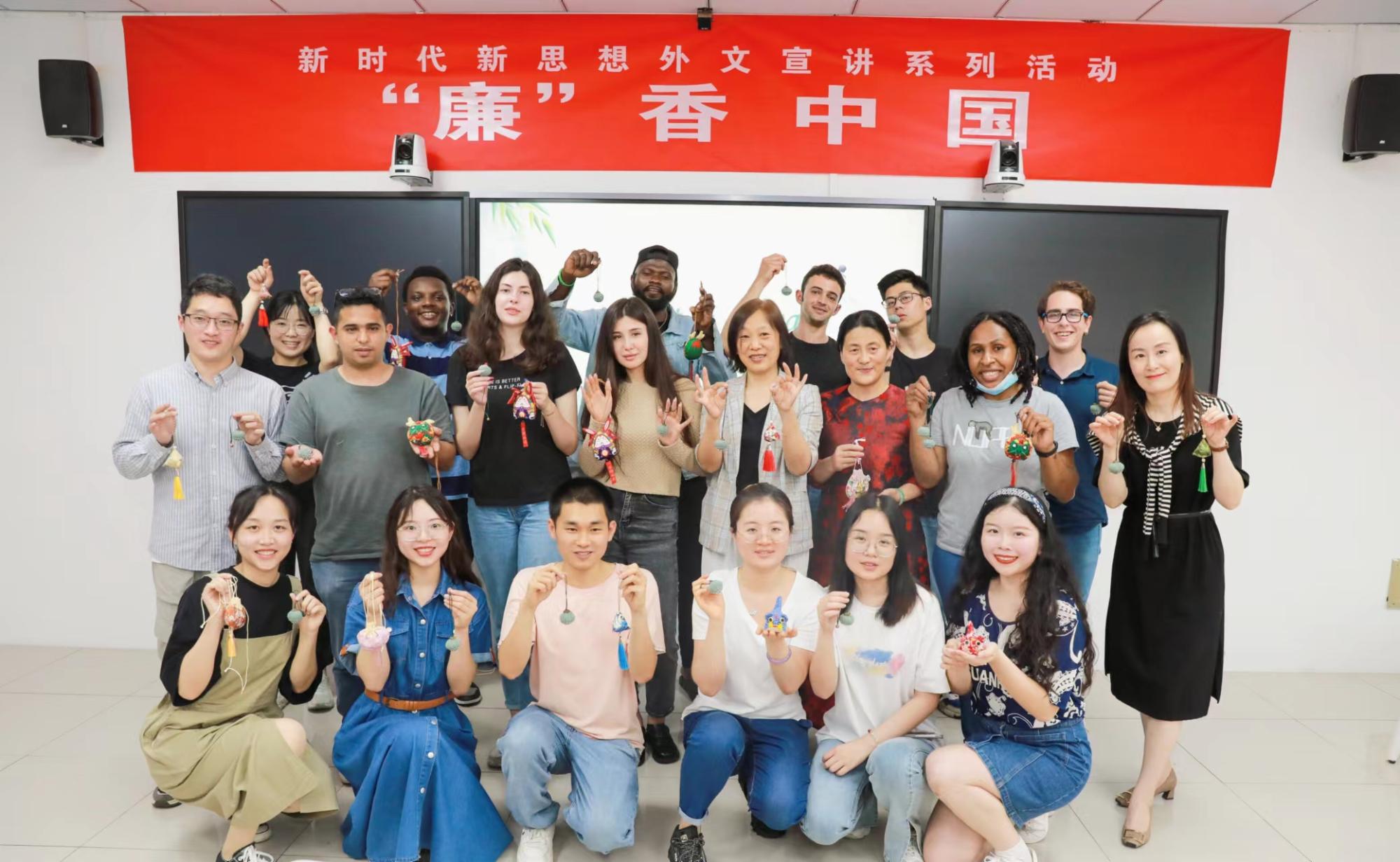 外文宣讲团开展的以“廉香中国”为主题的外文宣讲活动,中外大学生相聚一堂,以“莲”寓“廉”,共品清廉思想,共度端午佳节。