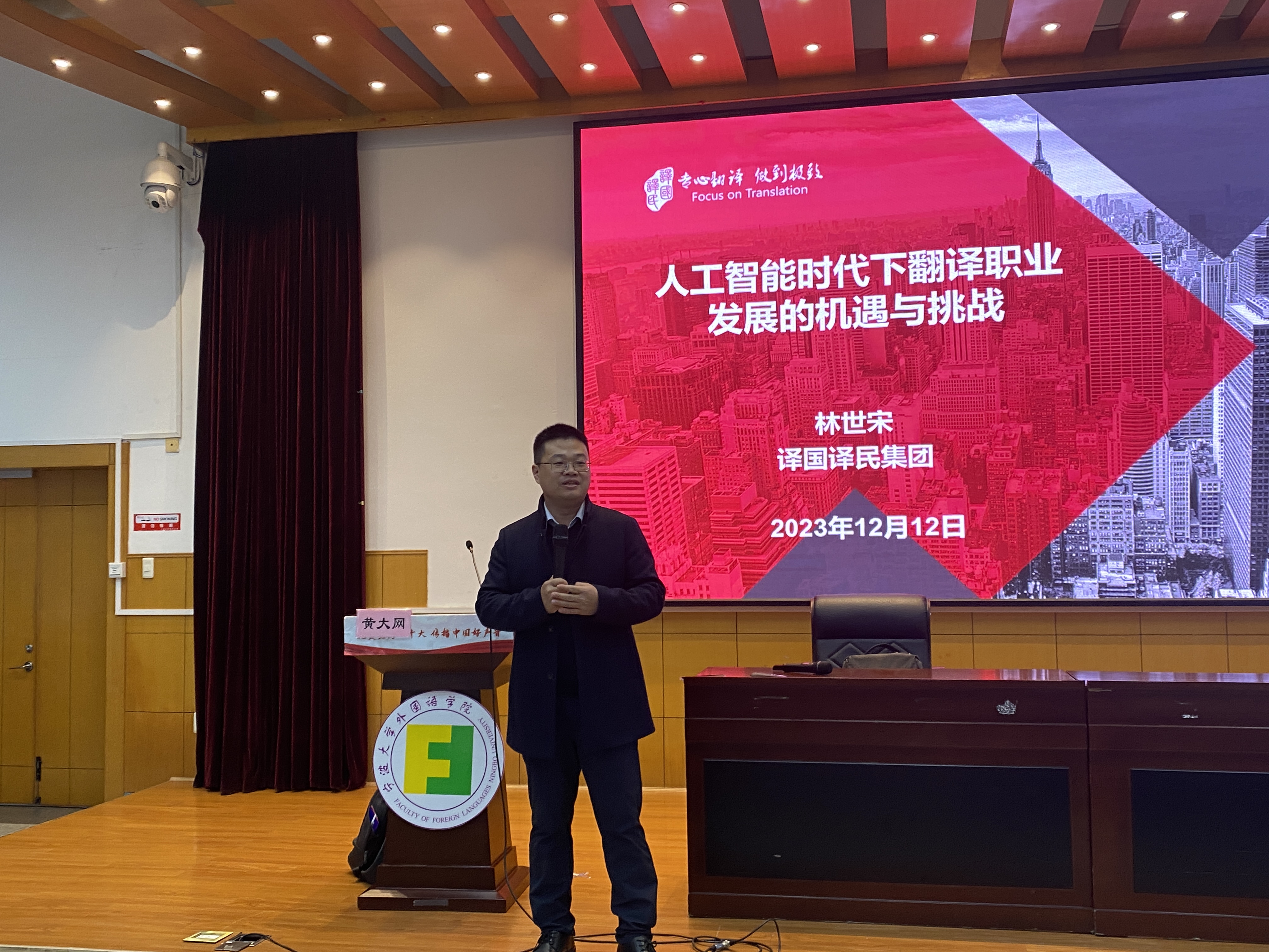 学生做了题为“人工智能时代下翻译职业发展的机遇与挑战”的讲座。作为二十年翻译行业从业者,林董与大家共同交流,探讨在人工智能时代,翻译行业面临前所未有的挑战的背景下,机器翻译是否会替代人工翻译,学习翻译是否还有前途,以及同学们如何应对挑战等问题。本次讲座由翻译硕士教育中心黄大网主任主持,多米体育网
