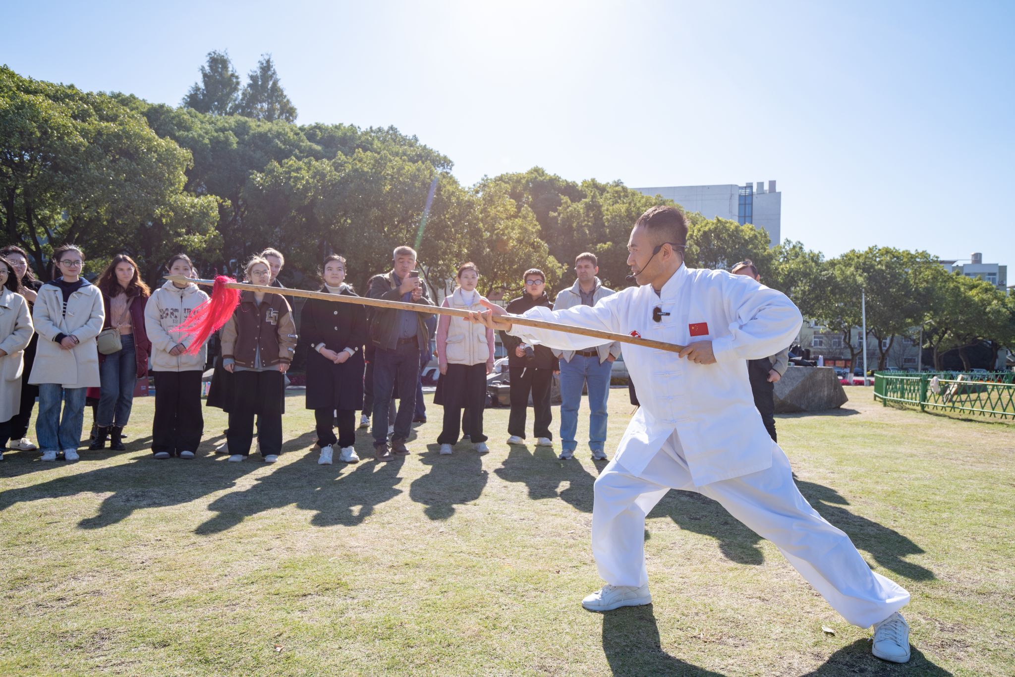 国际课程《跨文化交际》的户外体验教学中,吴氏开门八极拳第九代传人、双语教学团队的崔振峰老师正带领中外学生沉浸于八极拳的演练之中,展示了中国传统武术的精髓与韵味。接着,嘉宾们来到黄庆苗黄陈月莉伉俪楼群,步入了位于潘天寿建筑与艺术设计多米体育网