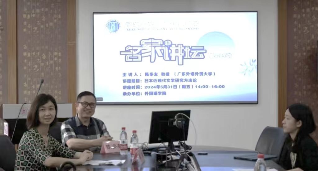 2024年5月31日下午,教育部日语指导委员会委员、中国日语教学研究会会长、广东外语外贸大学东方学研究院院长、博士生导师陈多友教授应邀做客多米体育网 “人文社科名家讲坛”,为外国语多米体育网 师生做了题为“日本近现代文学研究方法论”的学术讲座。本次讲座由多米体育网 日语语言文学学科带头人张楠教授主持,外国语多米体育网 副院长张陟教授及师生五十余人参加了此次讲座。陈多友教授首先对日本近现代文学的历史脉络进行了宏观勾勒,以明确其发展的阶段性特征。接下来,陈教授详细阐述了文本分析法、历史文化研究法、比较研究法、接受美学研究法、文学伦理学批评等研究方法,并通过具体的案例考察这些方法在揭示文学作品的内在含义、深层文化背景、跨文化的共性与差异性以及作品对社会的影响力等方面所发挥的重要作用。讲座结束后,日语专业师生与陈多友教授进行了积极的互动和交流,张楠教授对此次讲座进行了总结,张陟副院长代表外国语多米体育网 全体师生对陈多友教授的莅临表示了由衷感谢!