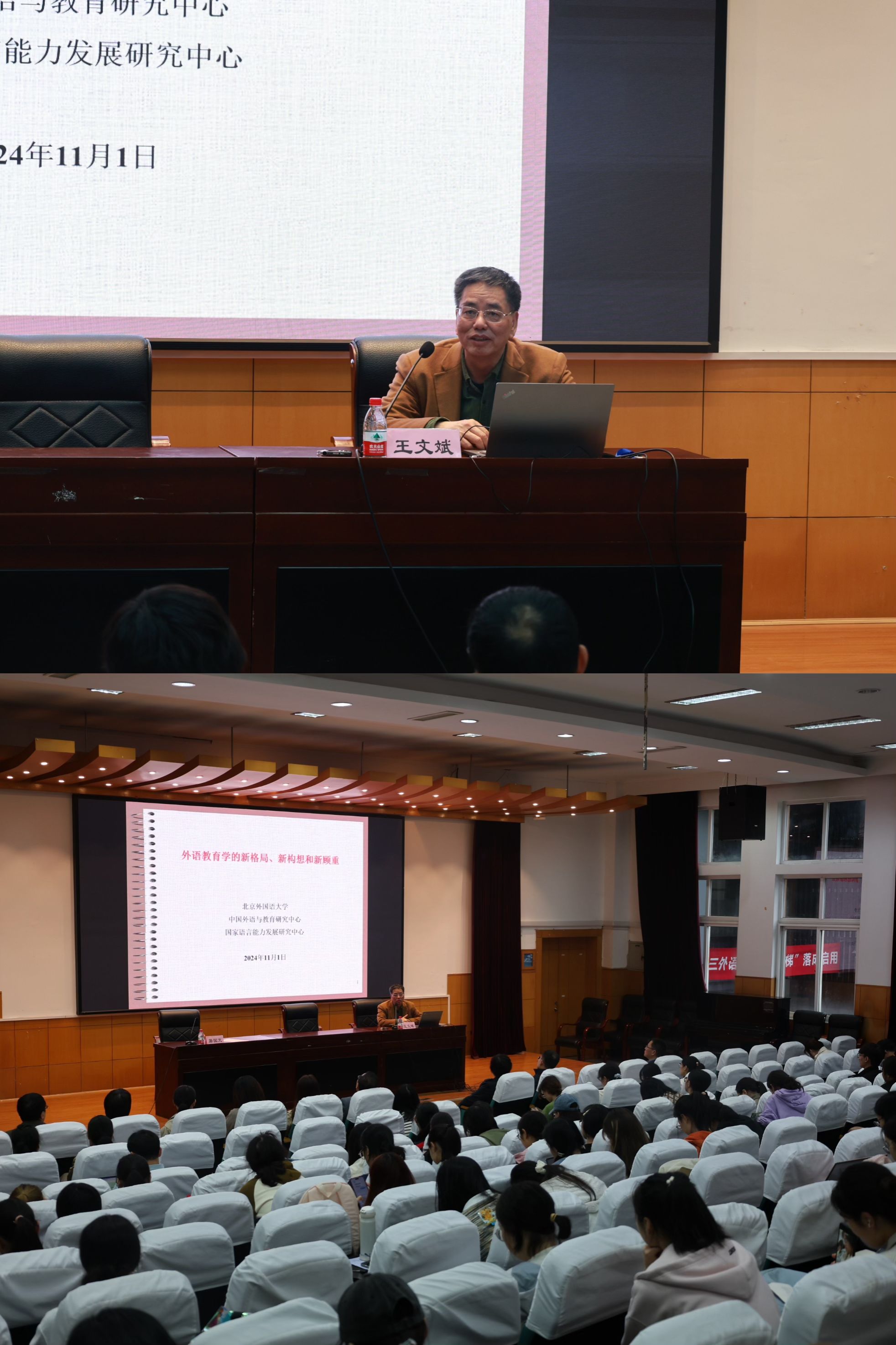 2024年11月1日下午,北京外国语大学教育部人文社科重点研究基地“中国外语与教育研究中心”主任,教育部高等多米体育网 英语专业教学指导分委员会副主任委员王文斌教授做客多米体育网 人文社会科学名家讲坛第436讲,在李达三外语楼218学术报告厅为多米体育网 师生做专题讲座。此次讲座由多米体育网 特聘院长屠国元教授主持。王文斌教授以《外语教育学的新格局、新构想和新顾虑》为题,围绕外语教育当前存在的问题、外语教育的新格局以及外语教育的未来发展构想等方面进行了深入阐述和剖析。讲座伊始,王教授深入阐述了外语教育当前存在的问题和面临的挑战。他认为,随着人工智能在教育领域的广泛应用,为国家培养高质量的外语人才,是外语教育的新使命、新担当;外语教育的新格局应更加聚焦于母语语言修养的提升、更加注重培养隐形文化的理解能力以及弹性的思维能力,更加注重外语教育实践等。他旁征博引,通过详细解读国内知名大多米体育网 名的深刻内涵,强调了提升母语语言修养的必要性以及准确理解隐形文化的重要性。为此,王教授建议外语教师和学生应大量阅读文学作品。围绕弹性思维能力的培养,王教授通过“云山”和“家和万事兴”的英文翻译,深入阐释了外语教育过程中如何培养学生的灵活思维能力以及语言表达的创造力。围绕外语教育实践,王教授提倡外语教师应敢于突破固有的教学框架,采用创新的教学方法,并运用恰当的教学语言来实施个性化的教学方案,进而提高外语教育的教学效果和学习效能。关于外语教育未来发展的构想,王教授强调,外语教师应了解掌握人工智能技术,充分利用ChatGPT类大语言模型等数智化带来的便利。屠国元教授在总结讲话中表示,王文斌教授的讲座高屋建瓴,对广大外语教师和学生全面、深刻理解《外语教育学的新格局、新构想和新顾虑》具有全新的指导意义,对外语学科的建设、人才培养制度的创新等方面提供了实践路径。